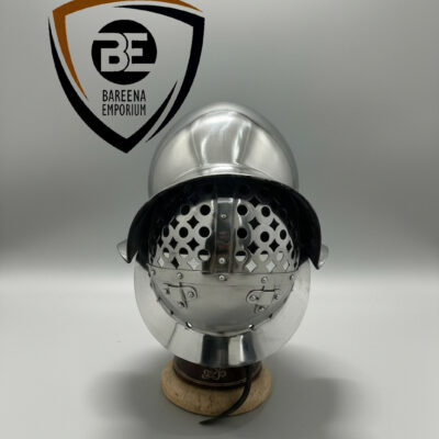 The Gladiator murmillo helmet, crafted from resilient 14-gauge steel, stands as a testament to the artistry and craftsmanship of ancient Rome. Its exquisite design marries both form and function, offering both protection and an awe-inspiring visage for the valiant warrior who wears it.