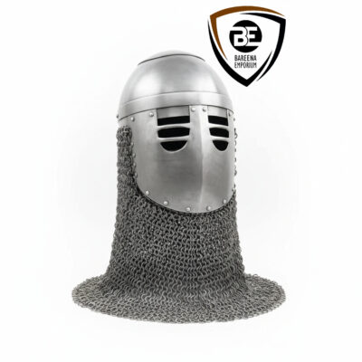 The helmet’s brim features elegantly rolled edges that not only enhance its durability but also contribute to its aesthetic appeal. These rolled edges are a testament to the attention to detail and the level of craftsmanship invested in its creation. They serve a practical purpose as well, providing additional protection to the warrior’s neck and shoulders during combat, reinforcing the helmet’s reputation as a formidable piece of armor.