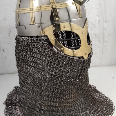 One of the standout features is the bargrill beneath the attached chainmail, providing enhanced protection for the face while maintaining breathability and visibility. The design adheres to strict standards, ensuring no gap exceeds more than an inch, making it both safe and authentic in its representation of Viking craftsmanship.